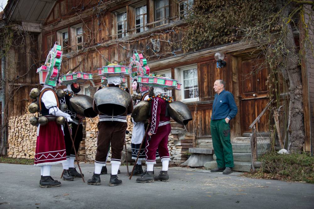 - A la Saint-Sylvestre (31 décembre) et à l’ancienne Saint-Sylvestre (13 janvier), des groupes de personnages costumés en «Silvesterchläuse» parcourent les maisons. Pour souhaiter la bonne année, ils forment un cercle et chantent un «Zäuerli», une forme de yodel sans paroles. Photograph: Monika Schmid © Monika Schmid, 2018